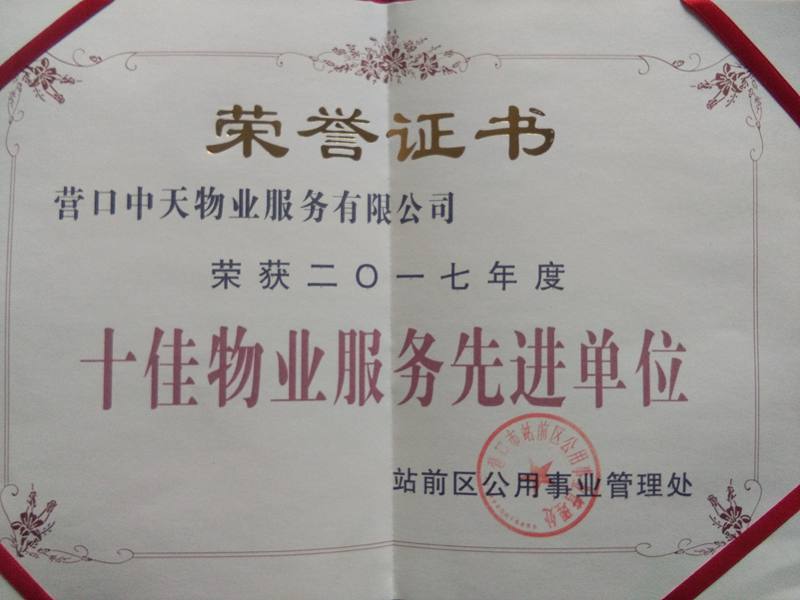 26營口市站前區(qū)公用事業(yè)管理處召開2017年度表獎大會,會上授予中天物業(yè) “2017年度十佳物業(yè)服務(wù)先進單位”稱號。