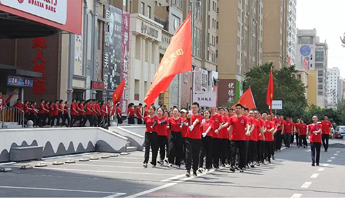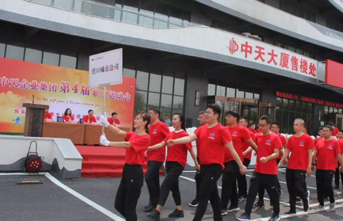 下午一點(diǎn)整,伴隨著一片鑼鼓聲,運(yùn)動(dòng)員入場(chǎng),接受集團(tuán)董事長(zhǎng)于寶權(quán)、總裁于洪波、執(zhí)行總裁于洪濤、副總裁周春雷以及各分子公司總經(jīng)理的檢閱,只見(jiàn)他們邁著整齊的步伐喊著響亮的口號(hào),展現(xiàn)出中天職工昂揚(yáng)向上的精神風(fēng)貌。隨后于洪波總裁致辭。舉辦職工運(yùn)動(dòng)會(huì),是中天集團(tuán)企業(yè)文化的一個(gè)重要傳承,目的是弘揚(yáng)“全民健身”精神,豐富企業(yè)文化內(nèi)涵,增強(qiáng)員工體質(zhì),提高企業(yè)凝聚力和向心力,傳頌和發(fā)揚(yáng)團(tuán)結(jié)協(xié)作精神和爭(zhēng)當(dāng)?shù)谝坏钠床庵荆玫卣故緢F(tuán)隊(duì)精神和凝聚力量。