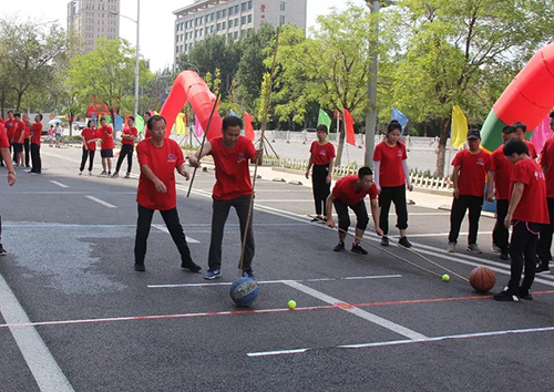 “趕豬跑”每隊(duì)6人,在跑道內(nèi)第1名隊(duì)員用竹竿同時(shí)趕籃球和網(wǎng)球至第2名隊(duì)員定點(diǎn)位置,依次傳遞至最后終點(diǎn)。球體不允許超出賽道,超賽道的從階段內(nèi)定點(diǎn)位置重新趕球。此項(xiàng)比賽,如何能控制好球的前進(jìn)方向和速度是關(guān)鍵,過(guò)于追求速度勢(shì)必會(huì)導(dǎo)致重新開(kāi)始。通過(guò)激烈的比拼,最終物業(yè)公司獲得了此項(xiàng)比賽的第一,大連公司和酒店公司分獲二、三名。