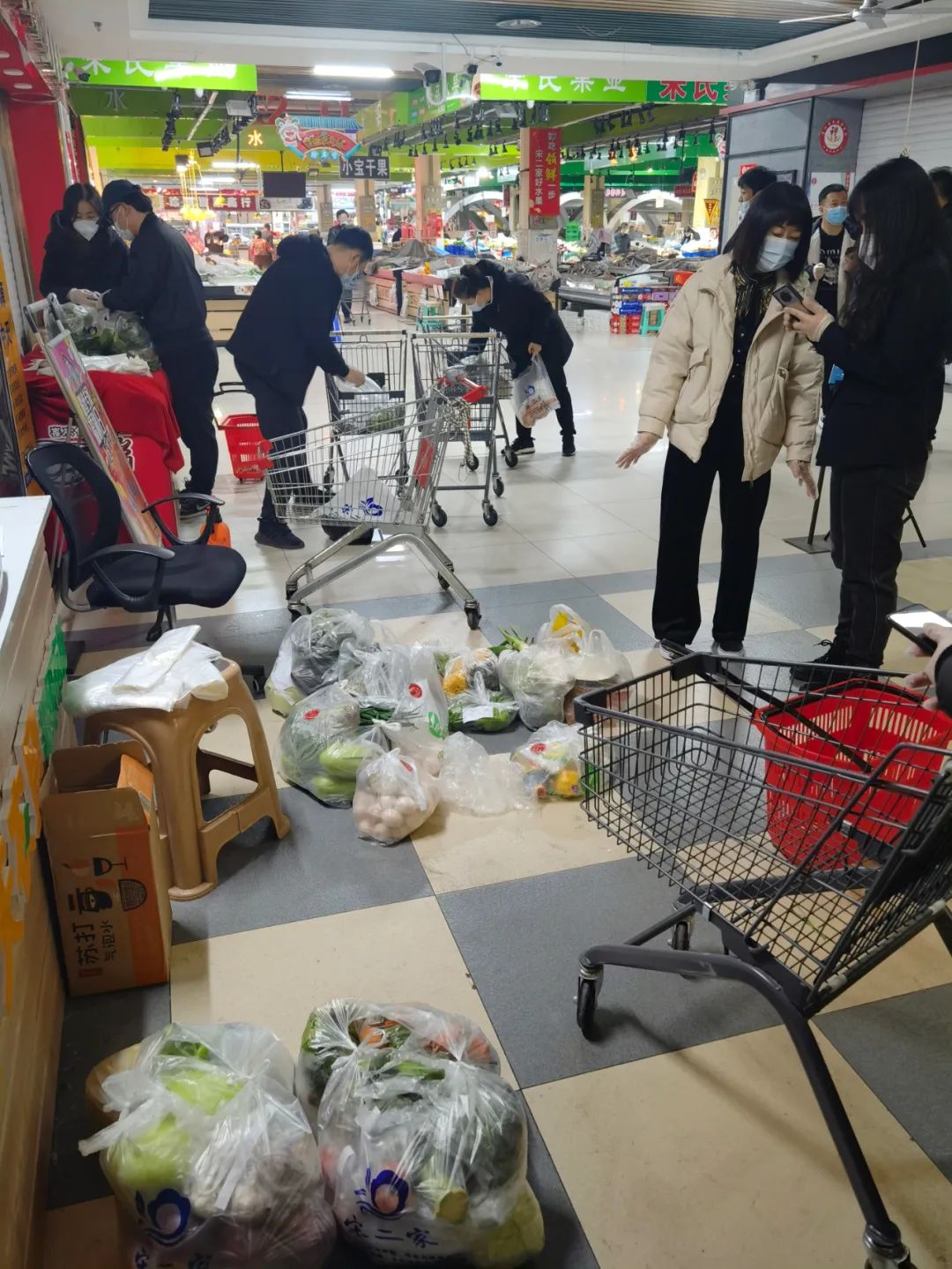 隨著疫情管控的發(fā)展,“中天農(nóng)貿(mào)市場”線上小程序訂單量飆升,每天增加到200多單,每一單貨物少則幾個物品,多則十幾種甚至二十幾種菜品,大家需要到各個攤位上分揀菜品,再經(jīng)過商戶的過秤,才能裝好袋子配送。因為品類不同、廠家不同、是否有貨物等關(guān)系,選購的過程中需要不斷地與訂單客戶電話溝通,每一次溝通都需要有足夠的耐心和解釋。3月18日,一個訂單留錯了電話號碼,分店經(jīng)理東巨峰頂著“騷擾電話”的罵名,尋找了二個多小時,才找到買家。