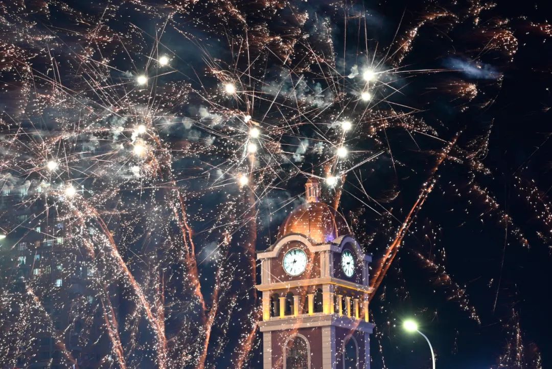 14種不同的璀璨煙花點亮營口夜空,美不勝收。煙花像一個技藝高超的魔術(shù)師將千變?nèi)f化的焰火在夜空中一一鋪陳開,那一朵朵鵝黃、銀白、嫩綠、淡紫、淺藍(lán)、粉紅的花朵在天空閃爍,火樹銀花,猶如萬家燈火,在一片輝煌盛景里,新一年的篇章徐徐開啟。