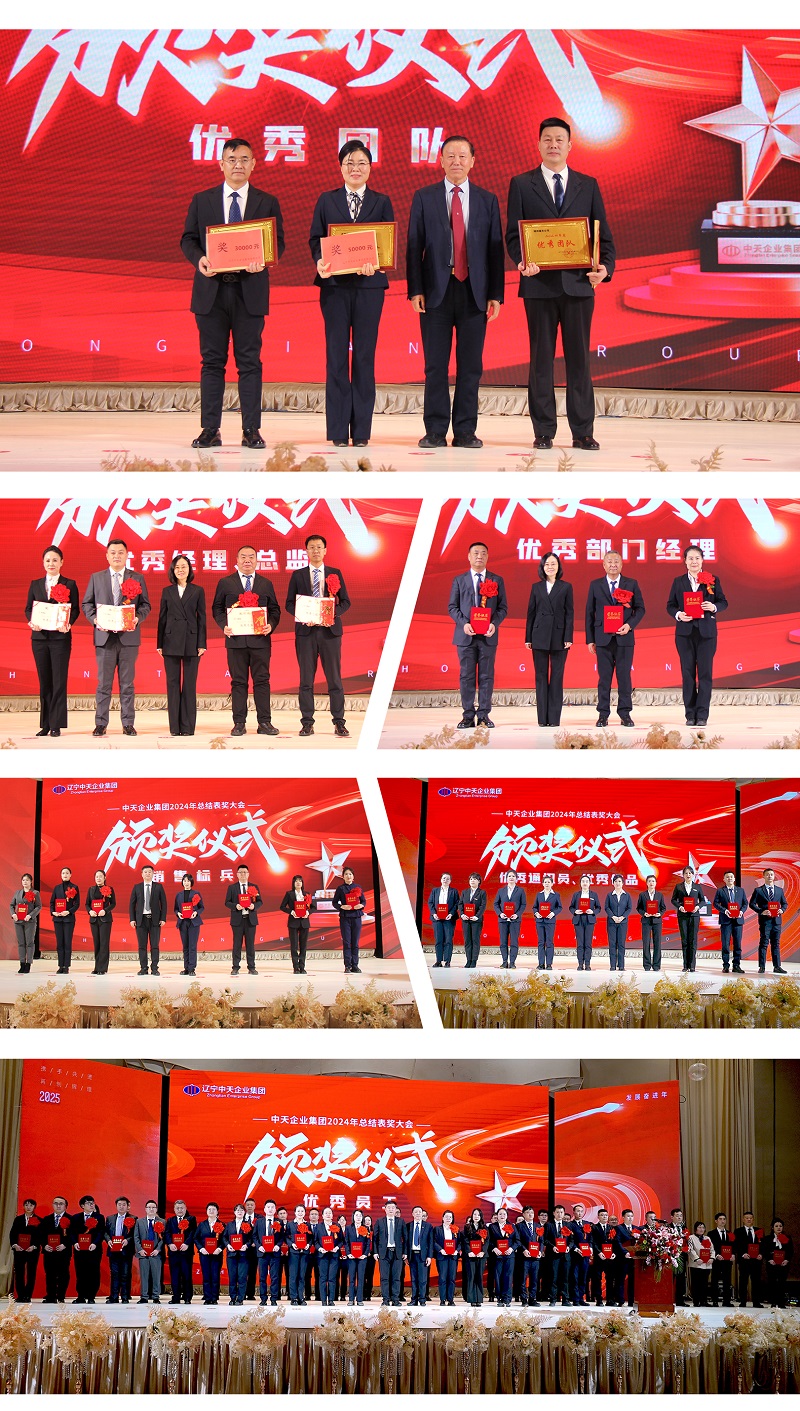 王曉青總裁助理宣讀了集團(tuán)2024年度表獎(jiǎng)決定,錦州城市公司、農(nóng)貿(mào)管理公司、集團(tuán)總部財(cái)務(wù)管理中心三個(gè)單位獲得優(yōu)秀團(tuán)隊(duì);大連城市公司總經(jīng)理許棕雯、酒店管理公司總經(jīng)理李敏獲得優(yōu)秀總經(jīng)理;集團(tuán)總部成本招采管理中心總監(jiān)譚學(xué)鍇、集團(tuán)總部項(xiàng)目管理中心總設(shè)計(jì)師盧詩(shī)揚(yáng)獲得優(yōu)秀總監(jiān);撫順城市公司副總經(jīng)理李巖、集團(tuán)總部人力資源部經(jīng)理王慧博、集團(tuán)總部工程裝修部經(jīng)理蘆偉三人獲得優(yōu)秀部門經(jīng)理;總部財(cái)務(wù)管理部出納主管姚蘭等47人獲得優(yōu)秀員工;錦州城市公司書(shū)香庭院項(xiàng)目銷售主管郭羽淑等7人獲得銷售標(biāo)兵。會(huì)上,舉行了隆重的表獎(jiǎng)儀式。同時(shí)還表獎(jiǎng)了《中天之窗》和《中天視角》優(yōu)秀通訊員和優(yōu)秀作品的獲獎(jiǎng)人員。