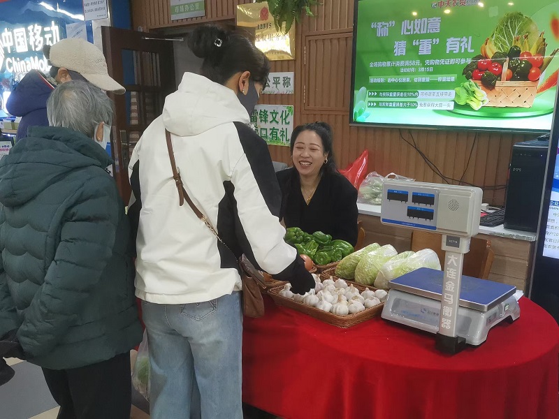 活動規(guī)則簡單有趣,顧客只需全場購物累計消費滿58元,即可憑消費憑證參與活動,隨意選擇一種蔬果并估測其重量,如果與實際重量誤差在10%以內(nèi),即可免費獲得;如果誤差超出,則可得到鼓勵獎——大蒜一頭。這種“贏也贏,輸也贏”的玩法,讓顧客們樂此不疲。